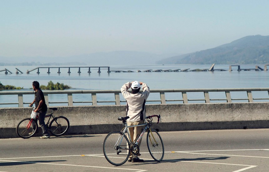 Apesar da concorrência quase desleal da TV, o fotojornalismo sempre mostra sua força em momentos de grande tragédia e comoção. O site boston.com – link Big Pictures – postou, horas depois do devastador terremoto registrado em terras chilenas uma série de grandes fotos produzidas por repórteres fotográficos de primeira linha. Escolhi as duas acima que retratam dois instantes diferentes da mesma tragédia. A ponte que ruiu como pedras de dominó em Viña del Mar e o flagrante do pai abraçado ao filho depois de ter a casa destruída.