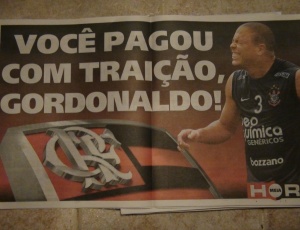 A provocação a Ronaldo começou. O tablóide popular Meia Hora, do Rio de Janeiro, não poupou o atacante do Corinthians. Com direito a pôster acusando o “Gordonaldo” de traição, o diário destaca a presença de travestis no Maracanã para o duelo diante do Flamengo, nesta quarta, brinca com os pesos do Fenômeno e de Adriano e ainda afirma que o camisa 9 alvinegro está com medo dos flamenguistas. Logo em sua capa, o tablóide avisa: “O Maraca vai afundar! Seu Barriga e Nhonho cara a cara”, apresentando uma montagem de Adriano e Ronaldo e os famosos personagens do seriado “Chaves” dentro do Maracanã. Mas outro destaque chama a atenção. “Grátis! Pôster pra zoar o Ronaldo”, oferece o diário.