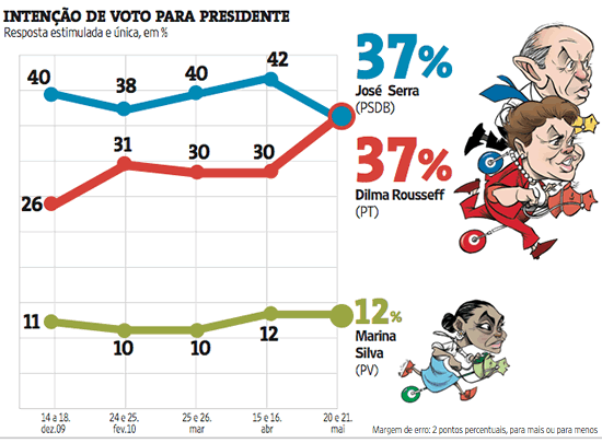 Na projeção de segundo turno, os dois estão tecnicamente empatados: a petista tem 46% contra 45% do tucano. Em abril, Serra aparecia dez pontos à frente da petista nesse quesito, com 50% a 40%. (Do Folha Online)