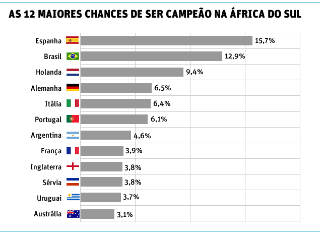 Equação pra lá, simulação pra cá, entre o atendimento a uma grande empresa e outra, os economistas descobriram que a seleção que tem mais chance de vencer a Copa é a da Espanha, atual campeã europeia, com 15,7%. A matemática deixou o Brasil em segundo (12,9%) e a Holanda com a terceira maior chance (9,4%). Na sequência, Alemanha (6,5%), Itália (6,4%), Portugal (6,1%), Argentina (4,6%), França (3,9%), Inglaterra e Sérvia (ambos 3,8%) completam os dez favoritos.