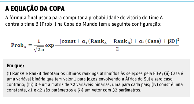 Se o máximo de matemática que você consegue ver no futebol é que 4-4-2 + 3-5-2 = 11 (jogadores) de cada lado, sinta-se um gênio. E chute à vontade o resultado final da Copa sul-africana. A conclusão pode ser tão certa quanto a dos economistas que usaram o tempo livre e a experiência com números para criar o modelo matemático que prevê o campeão. Não espere, entretanto, uma bola de cristal em campo. A tal fórmula-padrão de probabilidade já ajudou a prever até a recessão nos Estados Unidos. Ajudou? Enfim, foi com base nessa fórmula que economistas da LCA, uma das maiores e mais respeitadas consultorias do Brasil, criaram a tal equação matemática, e não mágica, para a Copa deste ano.