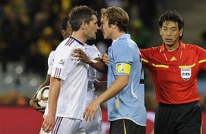 No segundo jogo, muita correria, marcação dura e lances ríspidos (incluindo a primeira expulsão do mundial, do uruguaio Lodeiro). Muito abaixo do que se poderia esperar de duas seleções campeãs do mundo. Sem inspiração ofensiva, a França tocava muito a bola para os lados, mas não agredia. Ribery nada fez e Henry, que entrou no final, também não modificou a feição do time.