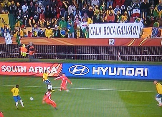 Exibida com destaque logo que a bola rolou na estreia brasileira na Copa, contra a Coreia do Norte, em Johannesburgo, uma faixa com a frase “Cala a boca, Galvão!” foi recolhida rapidamente nas arquibancadas do estádio Ellis Park. O adereço estava colocado exatamente no centro do campo, pouco acima das placas de publicidade, e endossava campanha iniciada no Twitter, desde a última sexta. Não se sabe se a faixa foi retirada por funcionários da Globo ou por fiscais da Fifa. Foi só começar o jogo inaugural do Mundial na África do Sul, entre a equipe da casa e o México, que os temas ligados ao torneio já estavam entre os dez mais comentados no microblog. E o assunto que liderava o ranking era justamente “Cala boca Galvão”, referindo-se ao festival de gafes do locutor esportivo.