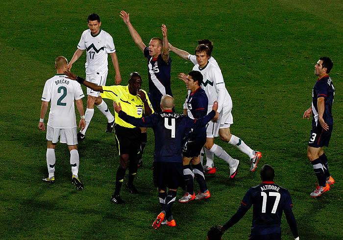 1. Com certeza, meteram a mão nos americanos. Aquele juizinho fraco, não sei oque ele enchegou no lance, para anular o gol legitimo, se aconteceu alguma infração dentro da area, foi a favor dos americanos, onde o Jogador nº 4, Bradley, este que é filho do treinador e marcou o gol de empate, estava sendo seguro na cara do juíz, é ate pensei que quando o juíz apitou, era para marcar o penalti, é não a anulação do gol!