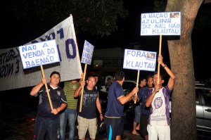 Cerca de 200 torcedores do Remo promoveram um ato de protesto contra o presidente Amaro Klautau, na noite desta segunda-feira, em frente ao estádio Evandro Almeida. Com faixas de “Fora Klautau!”, “Nação Azulina diz não ao Klautau” e “Somos contra a venda do Baenão”, eles exigiram a destituição do dirigente, considerado “traidor e inimigo do Clube do Remo”. Além de criticarem a negociação de AK para vender o estádio, protestaram contra a remoção do símbolo do clube do pórtico do Baenão, autorizada pelo presidente.