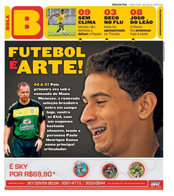 Mano Menezes, para minha surpresa, vem utilizando nos treinos um time radicalmente ofensivo, que pode ter até três homens na frente – Robinho, Pato e Neymar. Isso a partir de um meio-campo não menos insinuante, com Lucas, Ramires e Paulo Henrique Ganso. Mesmo que essa equipe não seja colocada em ação contra os norte-americanos, hoje à noite, já é um consolo saber que o treinador alimenta planos tão pouco ortodoxos, como esperamos há tanto tempo.