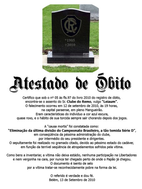 Como sarro o atestado ficou ótimo. Mas foram omitidos dois registros importantíssimos para a história do futebol do Pará. O primeiro que deixa um filho rejeitado, o qual hoje conta com uns noventae tantos anos. O segundo que dentre os bens a inventariar deixa a maior torcida do estado.