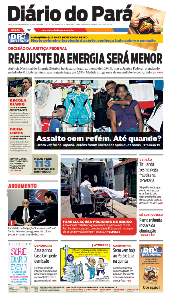 Capa do DIÁRIO, edição de terça-feira, 14