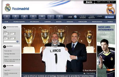 O ex-presidente do Brasil, Luiz Inácio Lula da Silva, fez uma visita ao Real Madri na manhã deste sábado, dia do clássico entre o clube e o Barcelona, pela 32ª rodada do Campeonato Espanhol. Lula, que ganhou uma camisa do time das mãos do presidente do Real, Florentino Perez, visitou o estádio Santiago Bernabéu e não economizou elogios à estrutura da equipe. “Não é apenas um estádio de futebol, é uma casa de espetáculo. É o melhor clube do mundo, porque se preocupa em jogar bem, contratar os melhores jogadores e saber de futebol. Tem uma estrutura extraordinária”, afirmou Lula. “Eu acho que qualquer cidadão do mundo que gosta de futebol, assiste jogo do Real Madri e gosta do Real Madri”, completou, sem dizer para quem torceria no clássico entre Real e Barcelona. (Com informações da Folha SP)