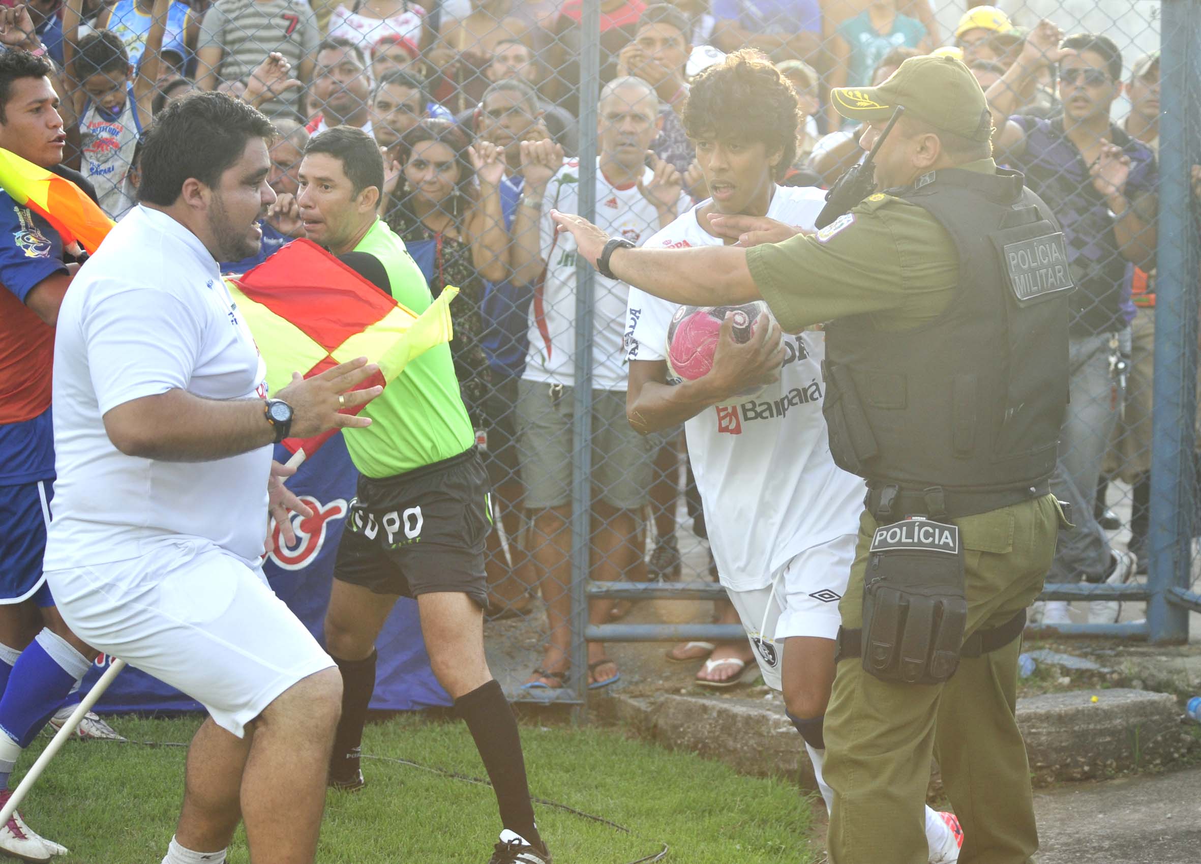 Porém, o diretor técnico da FPF pediu após a partida ao presidente do Águia, Sebastião Ferreira, e ao prefeito da cidade, Maurino Magalhães, que fossem providenciados um afastamento entre os bancos de reservas do mandante e o do visitante, porque, para Romano, as incitações começam lá. “Não tem mais como trabalhar com as duas equipes lado a lado, pois há muito xingamento de ambos os lados, então, tecnicamente, aqueles bancos não podem mais ficar ali”. (Foto: MÁRIO QUADROS/Bola)