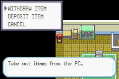 Dica: Vá no seu PC e escolha “WITHDRAW” e escolha “potion”. Elas curam 20 HP de seu pokémon. Útil, hm?