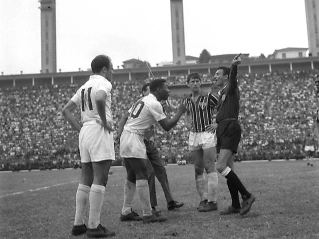 No gramado do velho Pacaembu, um clássico paulistano recheado de lendas do futebol brazuca. Pelo São Paulo, o zagueiro Bellini, capitão do escrete canarinho em 1958 e primeiro a erguer a Jules Rimet sobre a cabeça, gesto imitado por todos os seus sucessores. Do lado santista, Pepe (11) e o Rei Pelé. E, prima-dona como sempre, o árbitro Armando Castanheira da Rosa Marques.