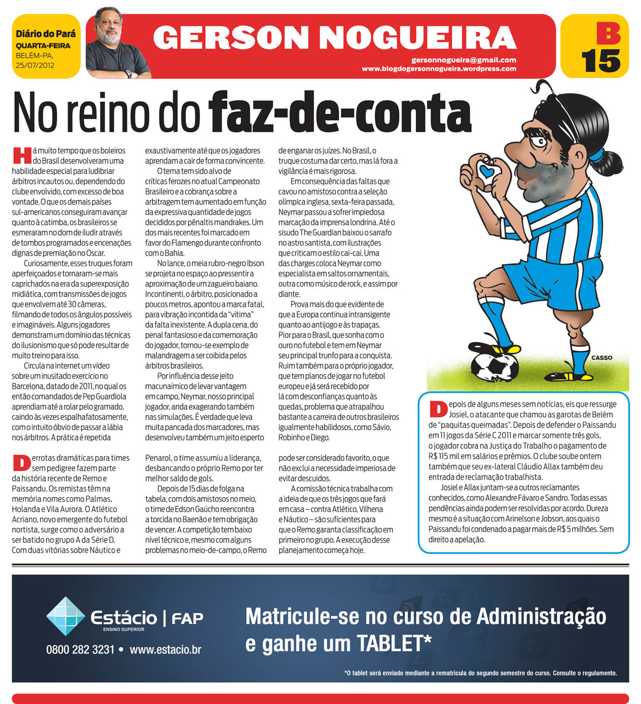 Prova mais do que evidente de que a Europa continua intransigente quanto ao anti-jogo e às trapaças. Pior para o Brasil, que sonha com o ouro no futebol e tem em Neymar seu principal trunfo para a conquista. Ruim também para o próprio jogador, que tem planos de jogar no futebol europeu e já será recebido por lá com desconfianças quanto às quedas, problema que atrapalhou bastante a carreira de outros brasileiros igualmente habilidosos, como Sávio, Robinho e Diego.