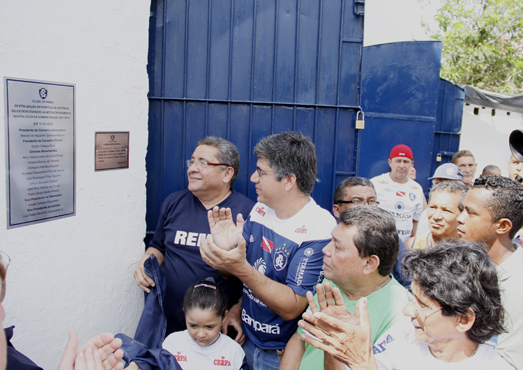 Com a presença do conselheiro remista Paulo Alves e sua filha, que foi a inspiradora da mobilização pela restauração do pórtico do Evandro Almeida, aconteceu na manhã deste sábado a cerimônia de recolocação do escudo do Clube do Remo na fachada do estádio. Uma placa em homenagem ao conselheiro e arquiteto foi descerrada pelo presidente Sérgio Cabeça Braz (abaixo), acompanhado de toda a diretoria do clube, grandes beneméritos, sócios e muitos torcedores. Dentre outros, prestigiaram o ato festivo o presidente do Conselho Deliberativo, Manoel Ribeiro, e o diretor jurídico do Remo, conselheiro Ronaldo Passarinho. Há dois anos, o escudo havia sido destruído por ordem do ex-presidente Amaro Klautau, que visava impedir o tombamento do estádio Evandro Almeida e, com isso, facilitar sua venda. (Fotos: EVERALDO NASCIMENTO/Bola)