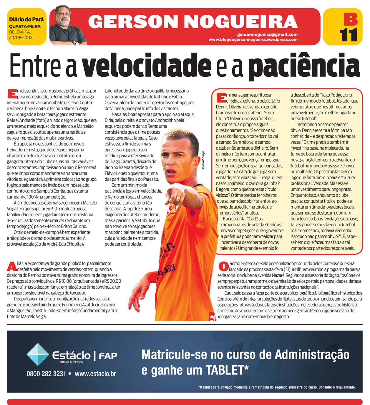 Com um mínimo de paciência e jogo em velocidade, o Remo tem boas chances de conquistar a vitória tão desejada. A rapidez é uma exigência do futebol moderno, mas a paciência é atributo que não envolve só os jogadores, mas principalmente a torcida, cuja ansiedade nem sempre pode ser controlada.