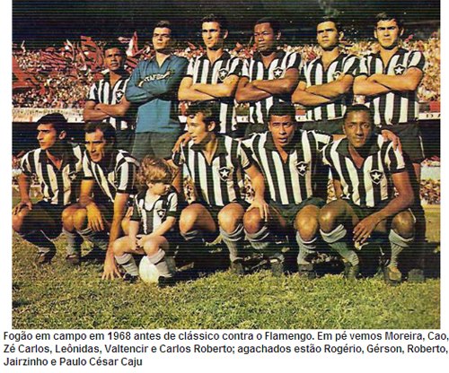 Este é, seguramente, o melhor Botafogo de todos os tempos, perdendo apenas para o time infernal de 1962/1963, que tinha Garrincha, Didi, Nilton Santos, Amarildo, Zagallo e Manga. Na tarde desta foto, o Bota goleou o Flamengo por 4 a 1 (gols de Gerson, 2, Zequinha e Jair) e conquistou a Taça Guanabara de 1968. Nessa formação, todos os cinco agachados foram titulares da Seleção Brasileira em algum momento – e todos estavam na convocação inicial para a Copa de 70.