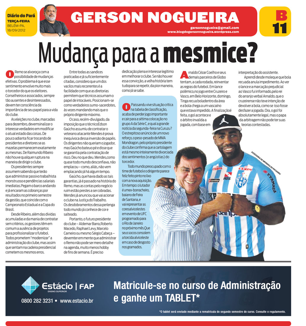 As eleições no clube, marcadas para dezembro, devem sinalizar o interesse verdadeiro em modificar o atual estado de coisas. De pouco adianta ficar trocando de presidentes e diretores se as mazelas permanecem exatamente as mesmas. De Raimundo Ribeiro não houve qualquer ruptura na maneira de dirigir o clube.