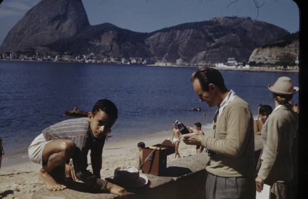 Walt Disney observa a garotada brincar com areia na praia de Copacabana, no Rio, na visita que fazia ao Brasil nos anos 50. Disney criou o personagem Zé Carioca e participava ativamente do esforço do governo americano para demonstrar simpatia pela América do Sul no período do pós-guerra. (Do arquivo da revista LIFE)