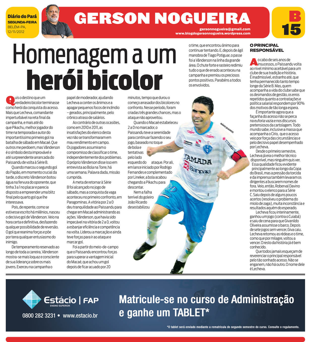 Quis o destino que um verdadeiro bicolor terminasse como herói da conquista do acesso. Mais que Lecheva, comandante imperturbável na reta final da campanha, e mais até do que Pikachu, melhor jogador do time na temporada e autor do importantíssimo primeiro gol na batalha de sábado em Macaé. Que outros me perdoem, mas Vânderson é o símbolo desta improvável e até surpreendente arrancada do Paissandu de volta à Série B.