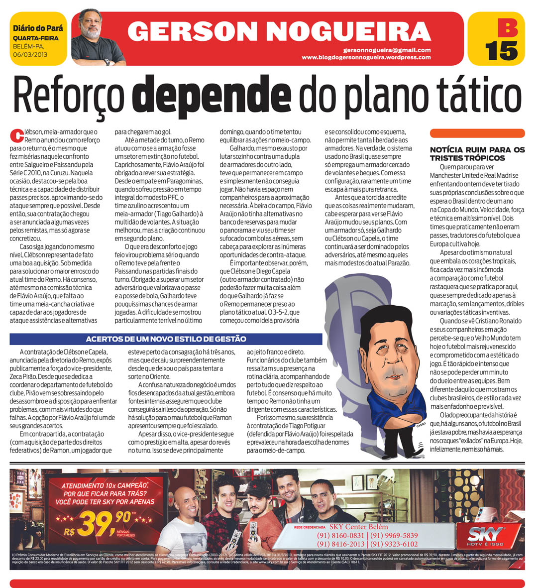 Caso siga jogando no mesmo nível, Clébson representa de fato uma boa aquisição. Sob medida para solucionar o maior enrosco do atual time do Remo. Há consenso, até mesmo na comissão técnica de Flávio Araújo, que falta ao time uma meia-cancha criativa e capaz de dar aos jogadores de ataque assistências e alternativas para chegarem ao gol.