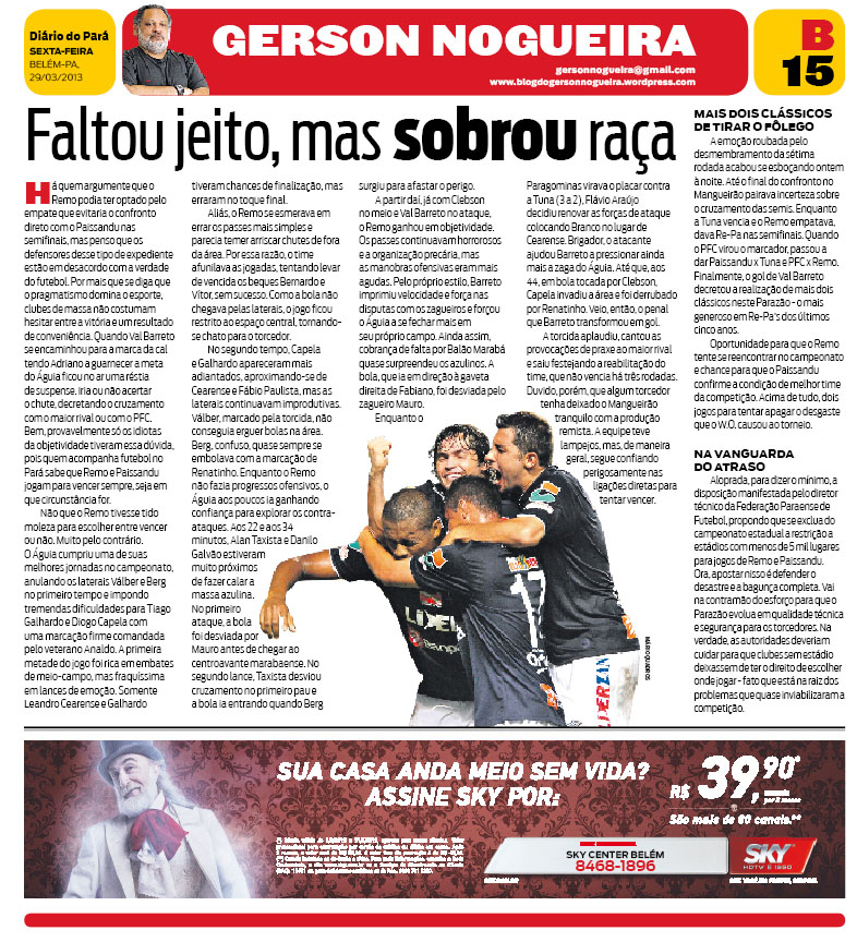 Há quem argumente que o Remo podia ter optado pelo empate que evitaria o confronto direto com o Paissandu nas semifinais, mas penso que os defensores desse tipo de expediente estão em desacordo com a verdade do futebol. Por mais que se diga que o pragmatismo domina o esporte, clubes de massa não costumam hesitar entre a vitória e um resultado de conveniência. Quando Val Barreto se encaminhou para a marca da cal tendo Adriano a guarnecer a meta do Águia ficou no ar uma réstia de suspense. Iria ou não acertar o chute, decretando o cruzamento com o maior rival ou com o PFC. Bem, provavelmente só os idiotas da objetividade tiveram essa dúvida, pois quem acompanha futebol no Pará sabe que Remo e Paissandu jogam para vencer sempre, seja em que circunstância for.