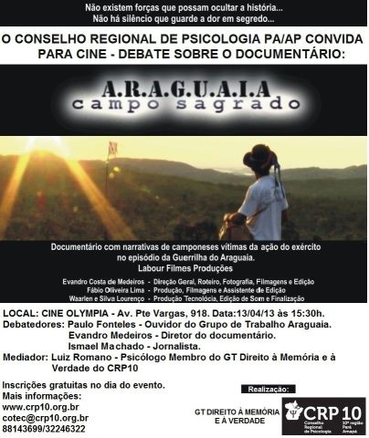 O Comitê Paraense pela Verdade, Memória e Justiça em conjunto com o Conselho Regional de Psicologia PA/AP exibirá no próximo sábado, no Cinema Olympia, a partir das 15h, o documentário “Araguaia-Campo Sagrado”, de Evandro Medeiros que, além de cineasta é professor da UFPA, do campus de Marabá. O filme, um longa de cerca de 50 minutos, cuja narrativa aborda os duros acontecimentos da invasão militar ao sul do Pará para sufocar o mais importante evento de resistência ao regime dos generais, a guerrilha do Araguaia, organizada na clandestinidade pelo Partido Comunista do Brasil (PCdoB) entre 1972 a 1975, é contundente pelos depoimentos de camponeses, ex-mateiros e soldados que atuaram naquele episódio.