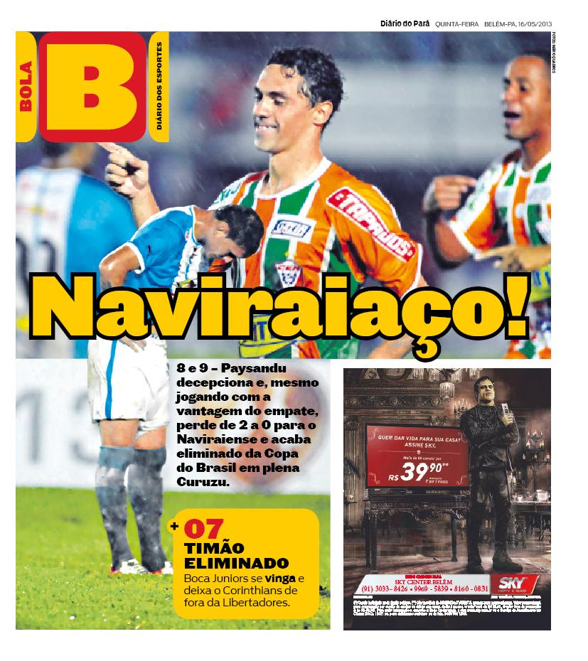 A data de 15 de maio está definitivamente incorporada à história do futebol paraense. Foi neste dia, há 10 anos, que o Paissandu perdeu para o Boca Juniors no Mangueirão, por 4 a 2, sendo eliminado da Taça Libertadores. Coincidência ou não, também em partida de volta, o Papão voltou a ser eliminado ontem, desta vez para o modesto Naviraiense, na Copa do Brasil. De quebra, o velho Boca também aprontou das suas, empatando (1 a 1) e alijando o Corinthians da Libertadores.