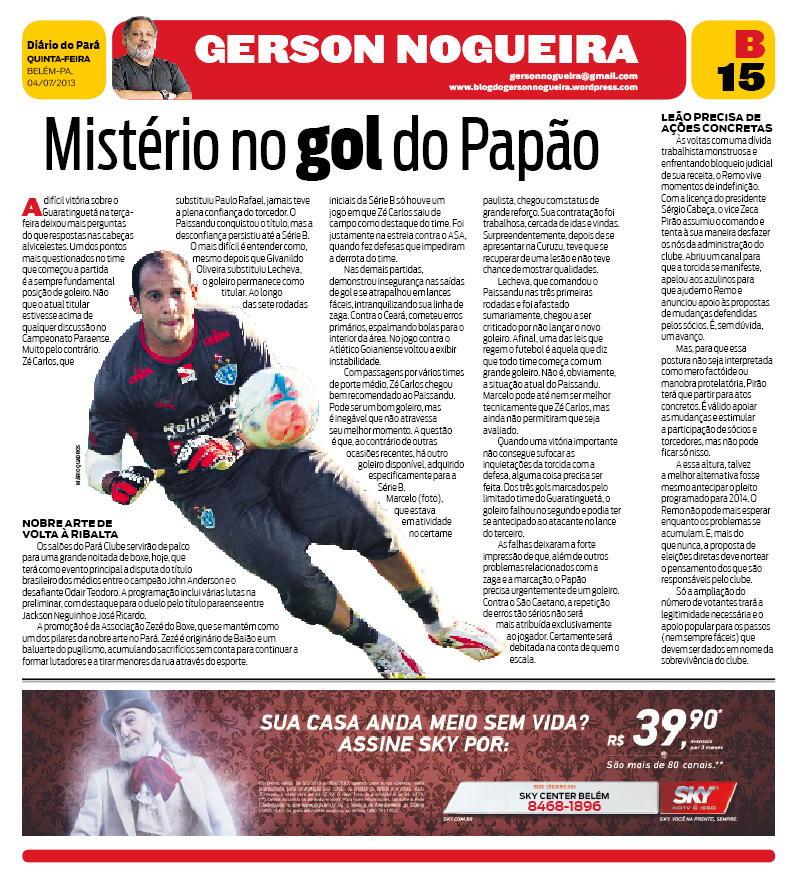 As falhas deixaram a forte impressão de que, além de outros problemas relacionados com a zaga e a marcação, o Papão precisa urgentemente de um goleiro. Contra o São Caetano, a repetição de erros tão sérios não será mais atribuída exclusivamente ao jogador. Certamente será debitada na conta de quem o escala.