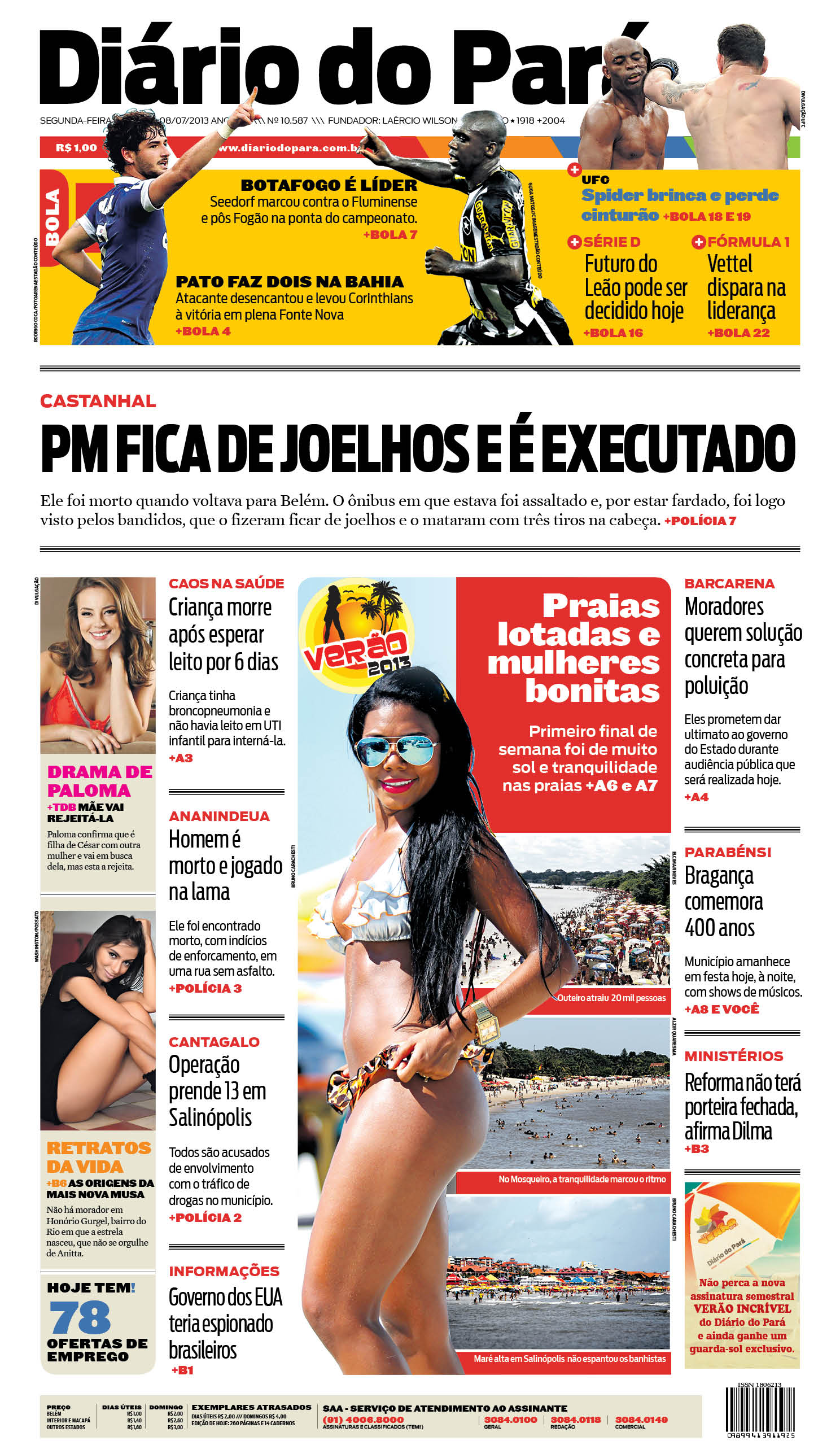 Capa do DIÁRIO, edição de segunda-feira, 08