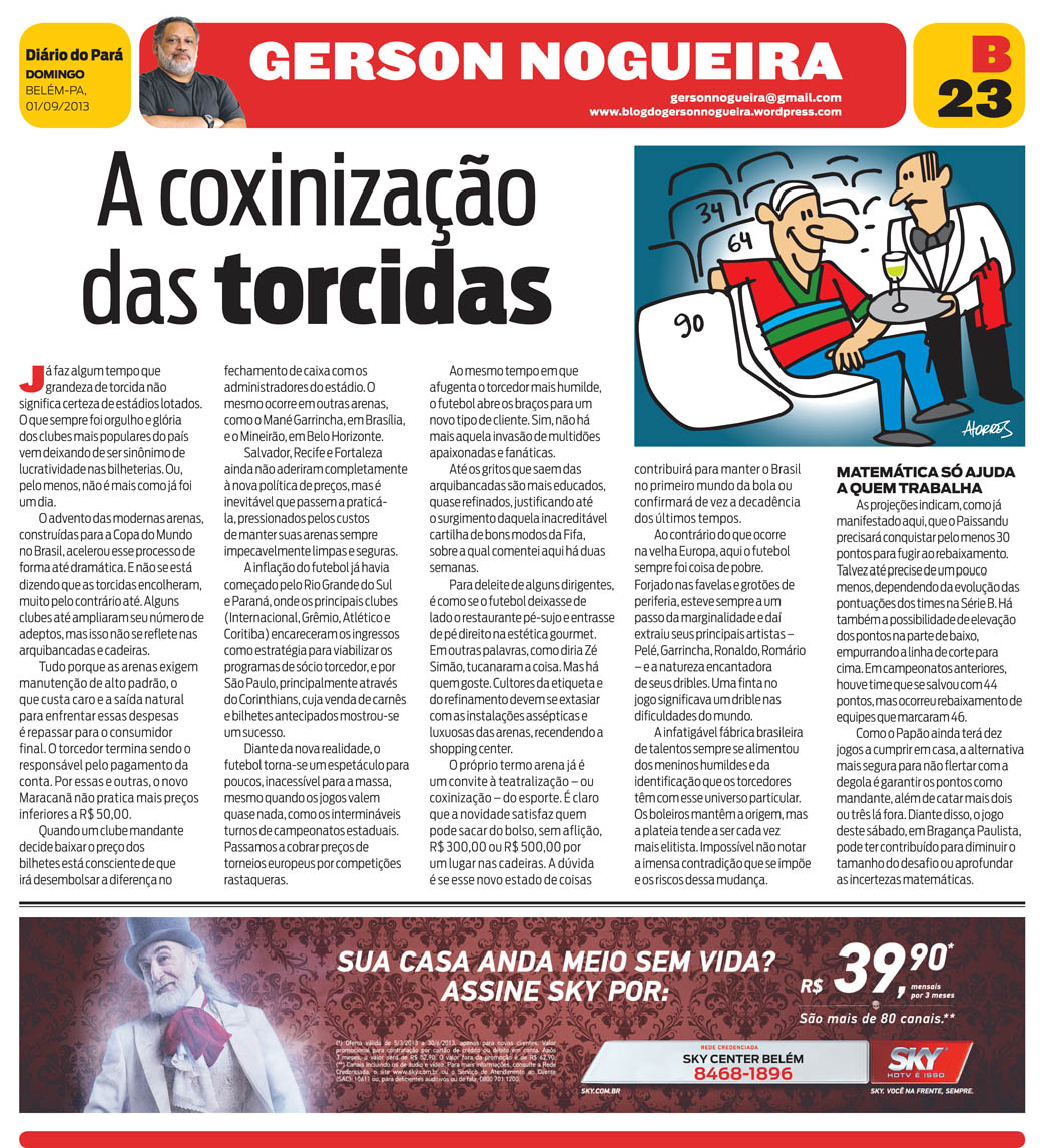 O próprio termo arena já é um convite à teatralização – ou coxinização – do esporte. É claro que a novidade satisfaz quem pode sacar do bolso, sem aflição, R$ 300,00 ou R$ 500,00 por um lugar nas cadeiras. A dúvida é se esse novo estado de coisas contribuirá para manter o Brasil no primeiro mundo da bola ou confirmará de vez a decadência dos últimos tempos.
