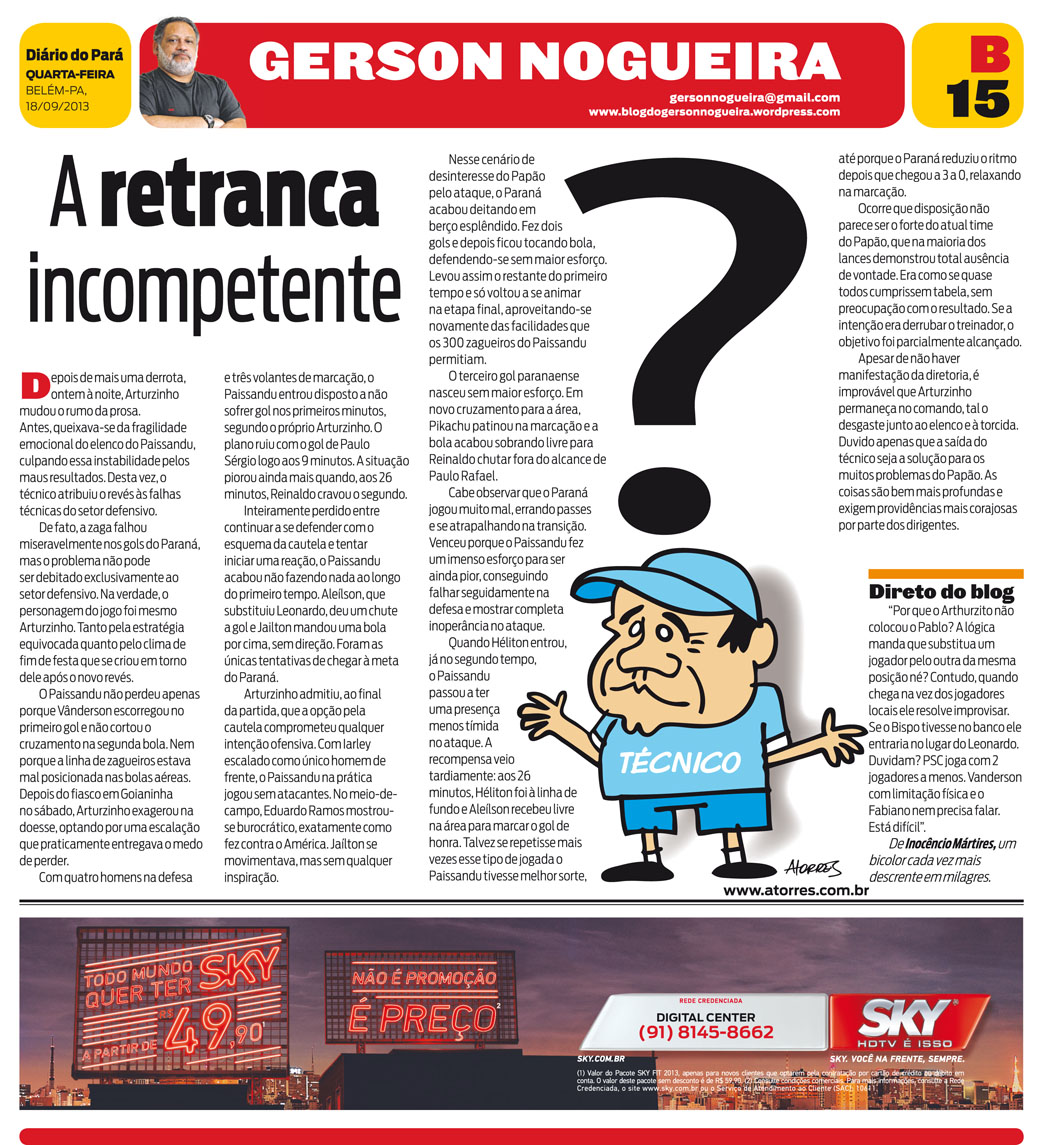 Apesar de não haver manifestação da diretoria, é improvável que Arturzinho permaneça no comando, tal o desgaste junto ao elenco e à torcida. Duvido apenas que a saída do técnico seja a solução para os muitos problemas do Papão. As coisas são bem mais profundas e exigem providências mais corajosas por parte dos dirigentes.