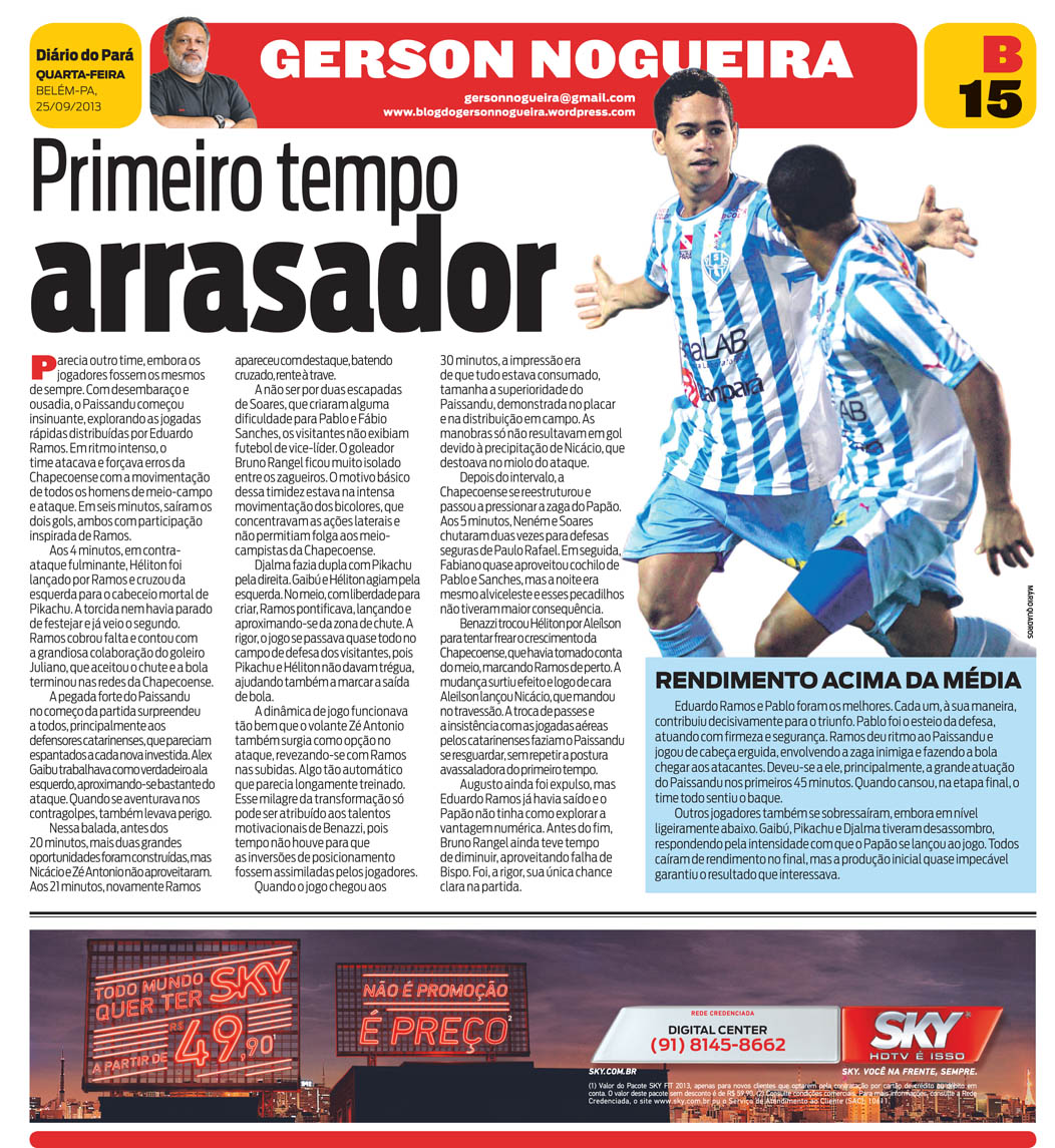 Parecia outro time, embora os jogadores fossem os mesmos de sempre. Com desembaraço e ousadia, o Paissandu começou insinuante, explorando as jogadas rápidas distribuídas por Eduardo Ramos. Em ritmo intenso, o time atacava e forçava erros da Chapecoense com a movimentação de todos os homens de meio-campo e ataque. Em seis minutos, saíram os dois gols, ambos com participação inspirada de Ramos.