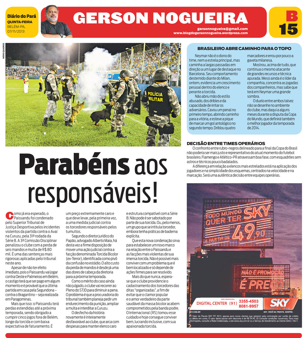 Que esta nova condenação sirva para estabelecer um novo marco na relação entre o Paissandu e as facções mais violentas de sua imensa torcida. Não é possível mais conviver com um problema que é bem localizado e só depende de ações firmes para ser resolvido.
