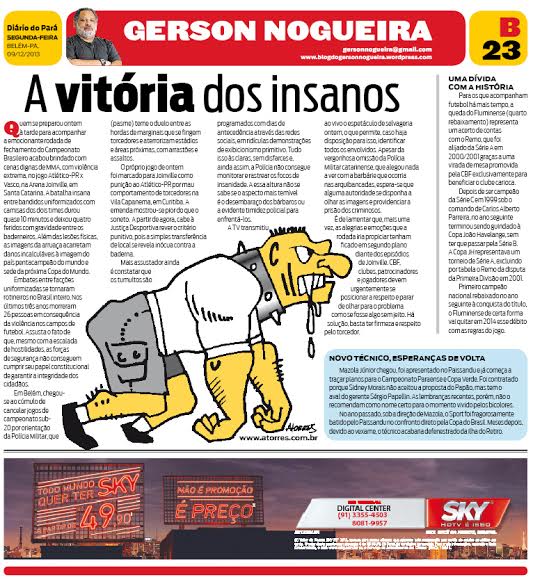 É de lamentar que, mais uma vez, as alegrias e emoções que a rodada iria propiciar tenham ficado em segundo plano diante dos episódios de Joinville. CBF, clubes, patrocinadores e jogadores devem urgentemente se posicionar a respeito e parar de olhar para o problema como se fosse algo sem jeito. Há solução, basta ter firmeza e respeito pelo torcedor.