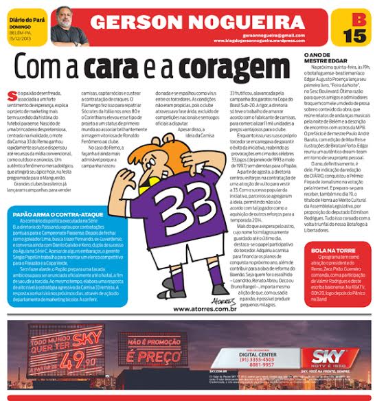 Só a paixão desenfreada, associada a um forte sentimento de esperança, explica o projeto de marketing mais bem sucedido da história do futebol paraense. Nascido de uma brincadeira despretensiosa, centrada na rivalidade, o mote da Camisa 33 do Remo ganhou rapidamente as ruas e dispensou até recursos da mídia convencional, como outdoor e anúncios. Um autêntico fenômeno mercadológico, que atingirá seu ápice hoje, na festa programada para o Mangueirão.