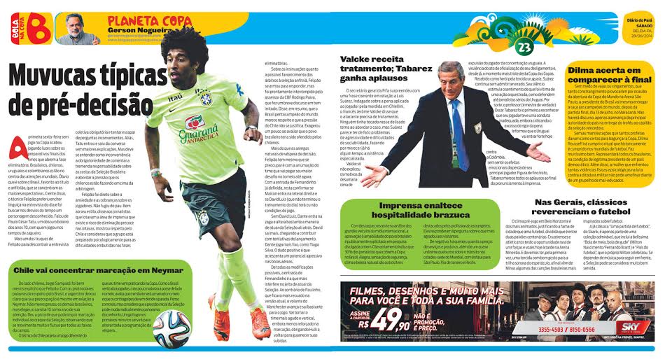 O técnico do Chile projeta um jogo diferente do que seu time vem praticando na Copa. Como o Brasil verticaliza jogadas, mas pouco valoriza a posse de bola no meio, avalia que o embate será amarrado no meio e que os contragolpes devem decidir a parada. Penso como ele, mas considero que a pressão inicial da Seleção pode mudar radicalmente o panorama do confronto. Um gol logo nos primeiros minutos servirá para alterar toda a programação da véspera.