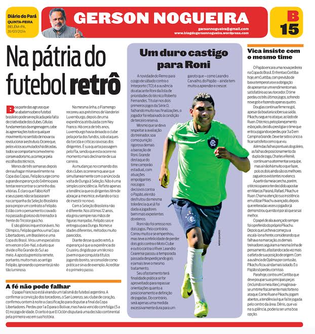 Mesmo que se deva respeitar a avaliação do treinador, soa como punição rigorosa demais a barração de Roni. Grande destaque do time campeão estadual, com atuações empolgantes nos jogos decisivos contra o Papão, ele não desfrutou da mesma tolerância que já foi dada a jogadores bem mais experientes do elenco.