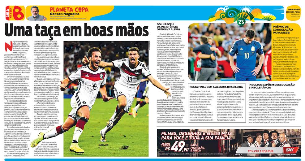 Ninguém se empenhou mais, antes e durante, para ganhar a Copa, mas ainda assim a poderosa Alemanha sofreu para dobrar a Argentina. O golaço de Mario Gotze só veio aos 9 minutos do tempo final da prorrogação, premiando a melhor seleção do torneio e desfazendo o risco de uma festa entregue ao time apenas esforçado. Apesar da credencial de favorita, a Alemanha chegou ao título encarando um jogo duríssimo, que pôs à prova a força ofensiva e de conjunto do time de Joachin Loew.