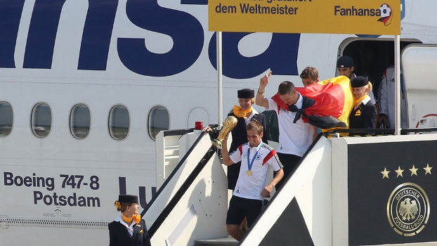 Assim como os jogadores recém-campeões da Copa do Mundo, o treinador da seleção alemã, Joachim Löw, agradeceu a homenagem feita pelas centenas de milhares de torcedores que apoiaram e receberam a equipe no Portão de Brandemburgo, em Berlim, nesta terça-feira. “Sem vocês não estaríamos aqui. Somos todos campeões do mundo”, afirmou diante do mar de pessoas que esperavam o desembarque dos ídolos desde cedo. Por problemas técnicos antes de decolar no Rio de Janeiro, o avião da delegação alemã aterrissou com mais de uma hora de atraso no aeroporto de Tegel, de onde os integrantes saíram rumo ao centro da capital.