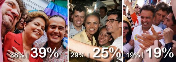 A presidente Dilma Rousseff lidera a disputa presidencial nos dois turnos e ampliou sua margem sobre os adversários, segundo a pesquisa Ibope desta terça-feira. Dilma agora tem 39%, contra 25% de Marina Silva e 19% de Aécio Neves. A vantagem sobre a candidata do PSB, que era de nove pontos na pesquisa anterior, agora é de 14 pontos. No segundo turno, Dilma supera Marina por 42% a 38%. Num eventual segundo turno entre Dilma e Aécio, a presidente também vence: 45% a 35%. A tendência é de que a partir de agora as pesquisas traduzam, de fato, o que dizem as ruas, daí a aparente surpreendente queda de Marina.