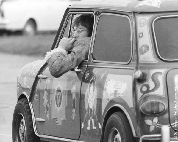 John Lennon a bordo do psicodélico carrinho de George Harrison, em Kent, Inglaterra. Idos de 1967.