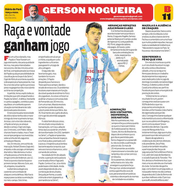 Depois da partida, franco como sempre, o técnico Mazola Junior analisou os altos e baixos do time. Fechou o comentário com uma frase que muitos podem repudiar, mas que traduz a realidade do futebol local: “Não existem craques no Pará. Se houvesse, não estariam na Série C”.
