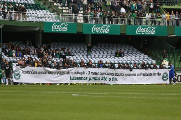 Os jogadores do Coritiba entraram em campo, no Couto Pereira, antes de vencerem o Atletiba por 1 a 0, com a faixa acima na foto. Vilson Ribeiro de Andrade, o presidente coxa que Paulo André, do Bom Senso FC , chamou de “espertalhão” por tentar enganar o movimento, há três meses não paga os salários do time que está na lanterna do Brasileirão e em vias de cair mais uma vez.