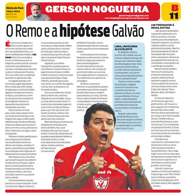 É curioso que sempre que o Remo se vê em apuros, no mato sem cachorro e buscando arrumar a balbúrdia interna, um nome é lembrado de imediato: João Galvão, técnico do Águia. Como a confirmar essa tese, os dirigentes azulinos voltam a analisar seriamente a possibilidade de convidar o treinador para comandar o Leão no Campeonato Paraense 2015, que volta a ser a competição prioritária na agenda do clube.
