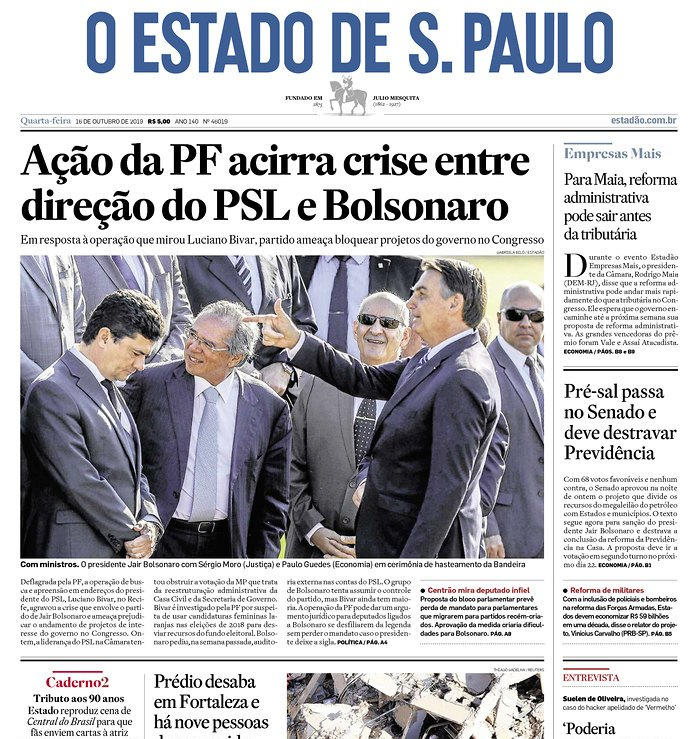 Uma imagem estampada na capa na edição desta quarta-feira (16) do jornal O Estado de S.Paulo, captada pela fotojornalista Gabriela Biló, mostra Jair Bolsonaro (PSL) com sua imortalizada imagem de arma nas mãos apontada para a cabeça do ministro da Justiça, Sergio Moro, sob risos de seu colega da Economia, Paulo Guedes.