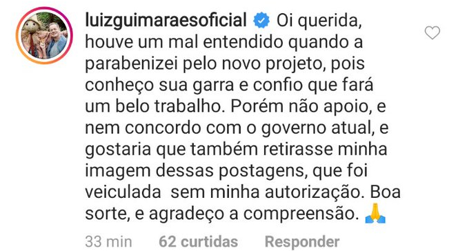 A publicação da atriz foi feita em meio às polêmicas envolvendo artistas que desejaram sorte à artista no comando da Secretaria e foram retratados por ela como apoiadores do governo. Em um áudio revelado em primeira mão pela Fórum nesta sexta-feira (31), a atriz Carolina Ferraz teceu críticas a Bolsonaro e solicitou que sua foto fosse prontamente retirada.