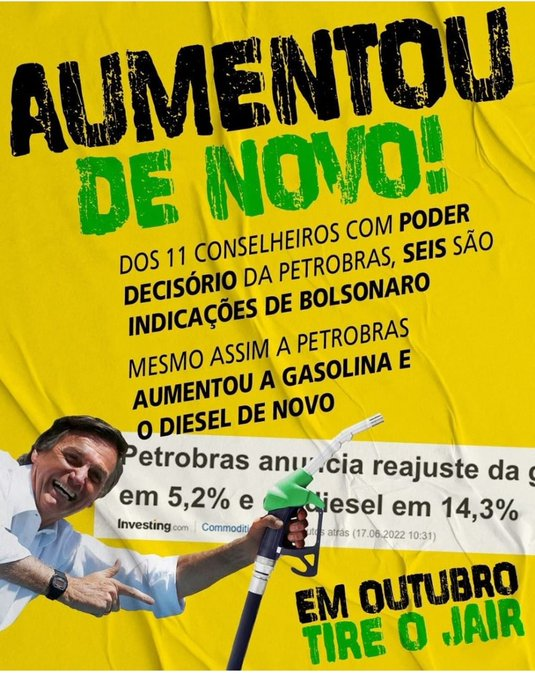 “Hoje, Bolsonaro, o Centrão e toda a turma bolsonarista vai tentar fazer parecer que é contra o aumento dos combustíveis. Mas, atenção, povo brasileiro! A verdade é que eles NÃO TÊM coragem de enfrentar o mercado. Se tivessem, decretariam o fim da política de preços dolarizados”. Bohn Gass, deputado federal PT-RS