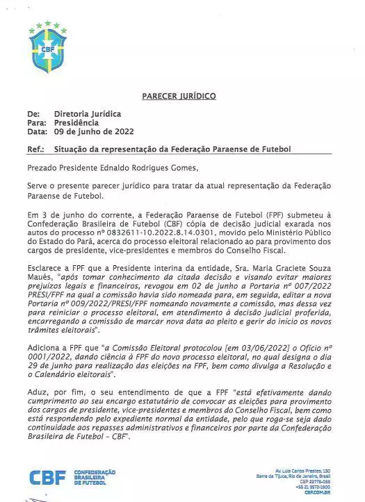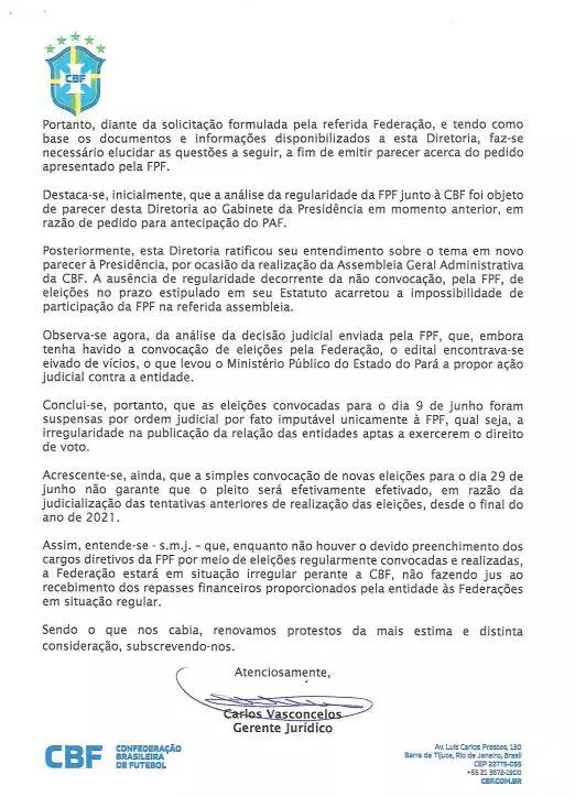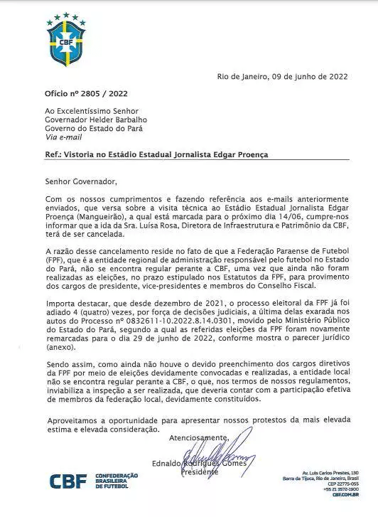 Segundo o documento, a decisão de tirar o jogo do Mangueirão foi tomada porque a Federação Paraense de Futebol “não se encontra regular perante a CBF, uma vez que ainda não foram realizadas as eleições, no prazo estipulado no estatutos da FPF, para provimento dos cargos de presidente, vice-presidentes e membros do Conselho Fiscal”.