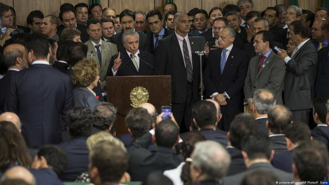 Algumas horas depois, sem cruzar com Dilma, Michel Temer entrou no palácio e assumiu o cargo de presidente. No mesmo salão, agora repleto de políticos que não frequentavam o local desde o governo Fernando Henrique Cardoso, como líderes do DEM e do PSDB, e de outros que mudaram de lado, Temer deu posse ao seu novo ministério em clima de triunfo e força .