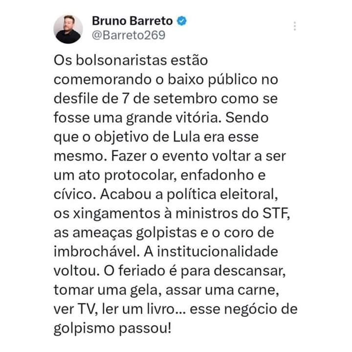 “Desde 2109 não se via um 7 de setembro tão tranquilo: sem fascistas fantasiados de verde-amarelo nas ruas, sem presidente arrotando golpismo, sem conversa fiada de que as Forças Armadas seriam o poder moderador da República. Relevadas as suas contradições – quem não as têm? -, contamos agora com um estadista de verdade no comando da nação. E Lula está de parabéns: portou-se à altura do cargo. Comemoremos, pois. E oremos pelas tristes almas ainda iludidas pelo fascismo bolsonarista”.